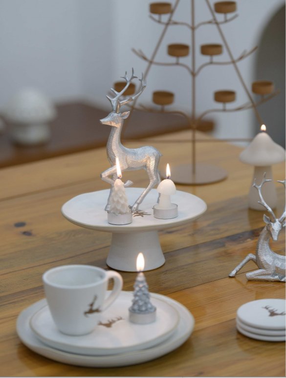 Candles aren’t just a light source—they’re the centerpiece of quiet, elevated home decor, blending warmth, texture, and cohesive design. The setup here exemplifies the trend: sleek, thematic candles (shaped like evergreen trees and mushrooms) pair with minimalist accents (silver deer figurines, neutral tableware) to craft a space that feels calm, intentional, and subtly festive.